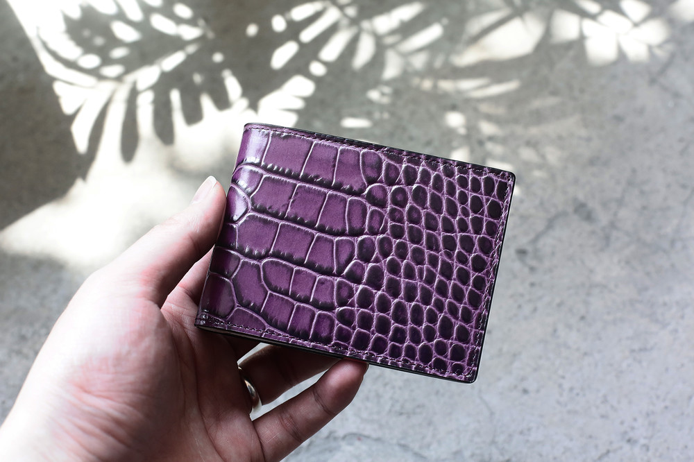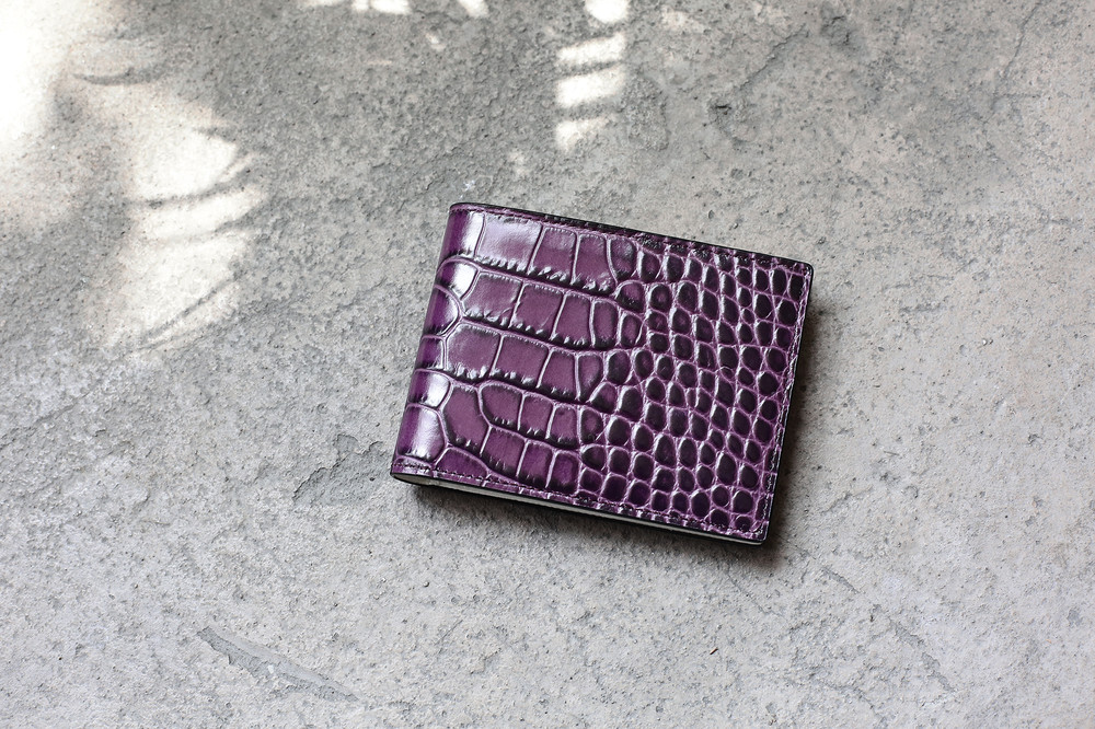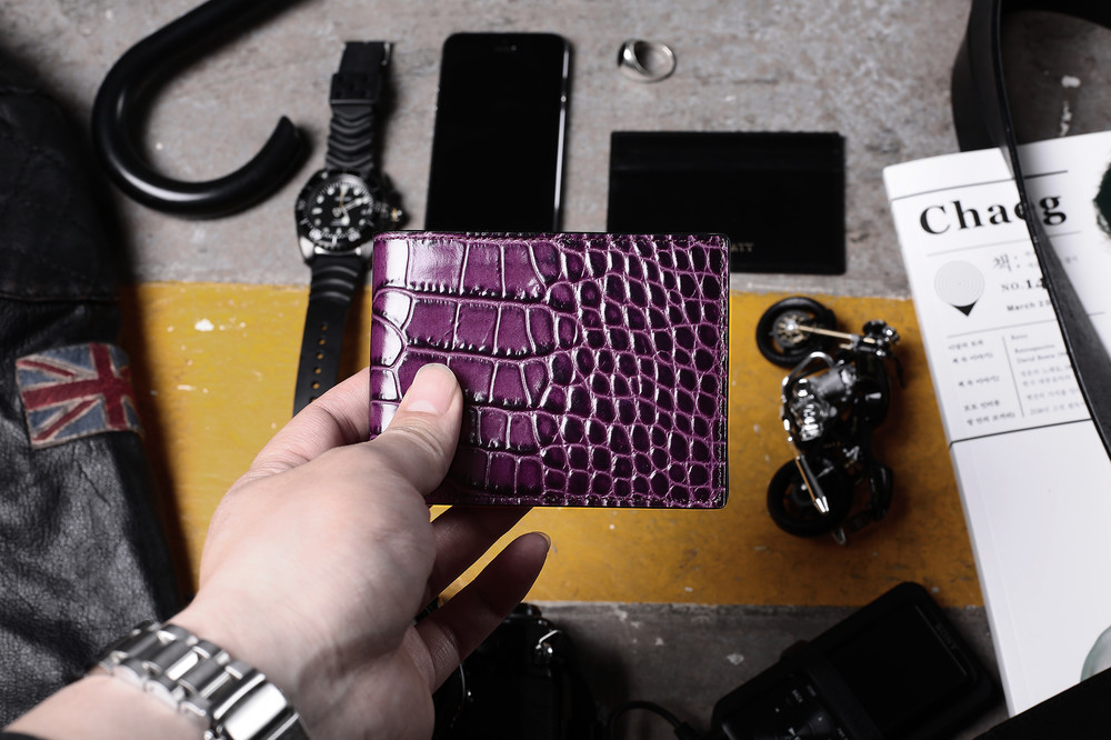 고급스러운 퍼플 컬러의 크로커 엠보 소가죽으로 제작한 남성용 반지갑입니다.