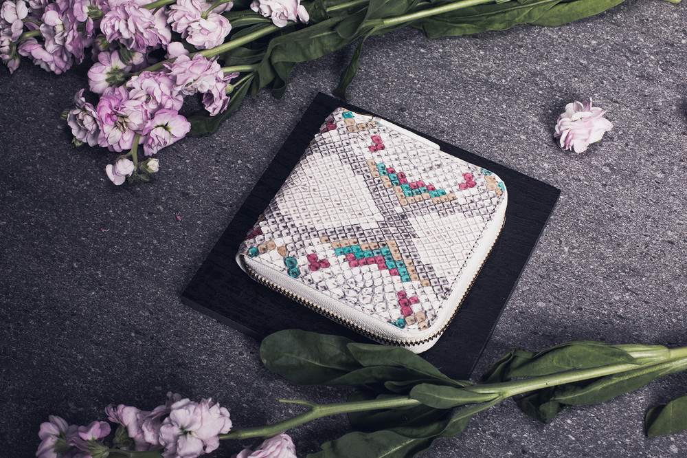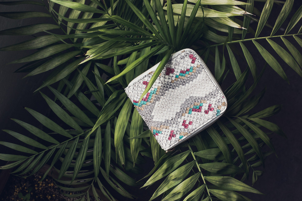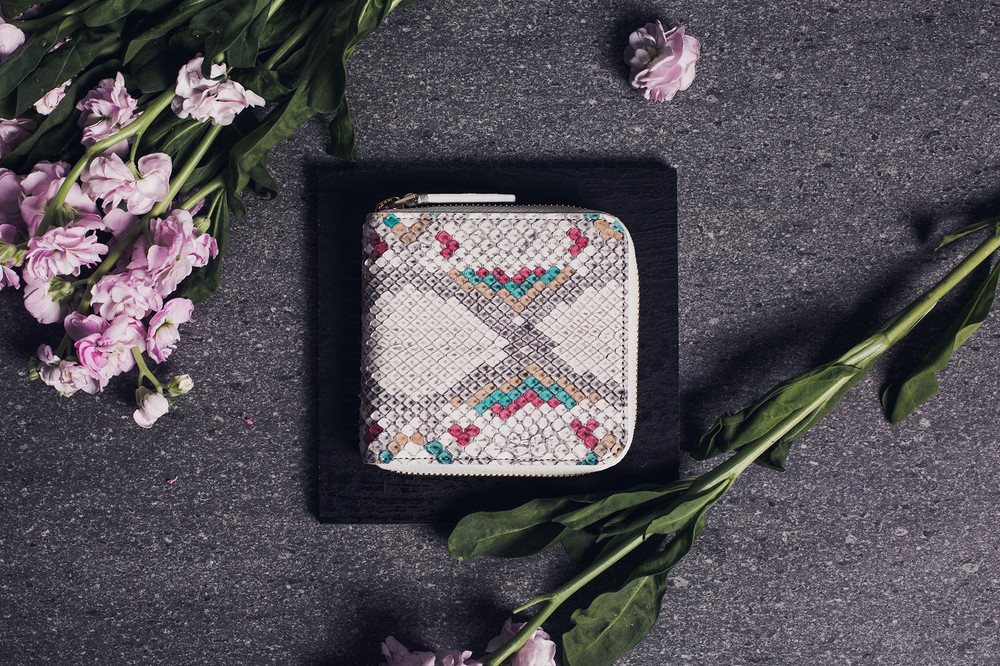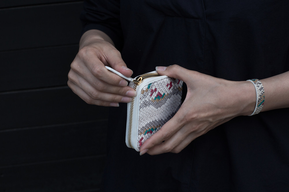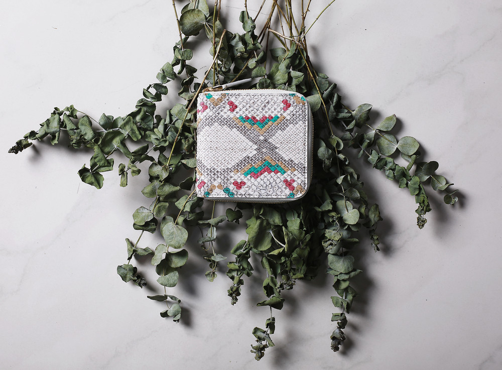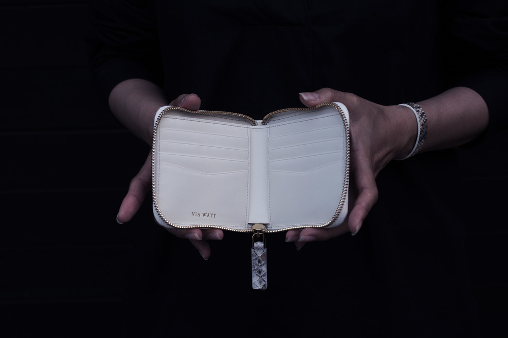 'Watch The Dream' python zip wallet 가죽 전문 디자이너 브랜드 비아와트의 'Watch The Dream' 컬렉션 파이톤 지퍼 지갑입니다. 이태리에서 핸드 페인팅 된 리얼 파이톤 가죽이 사용되었습니다. 고급 가죽으로 제작되어 촉감이 무척 우수하고 돋보이는 컬러감을 가지고 있습니다. 내부는 10개의 카드 포켓과 1개의 지폐 수납부로 이루어져 있습니다. 화이트 컬러의 이태리산 소가죽으로 마감하고 골드 컬러의 브랜드 로고가 각인되어 있습니다. 제품의 사이즈는 11 x 11 cm입니다.